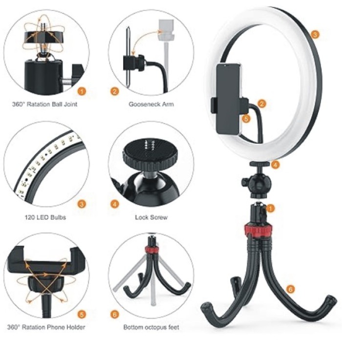 2. ADJUSTABLE RING LIGHT & PHONE HOLDER: With 360°ball head mounts, the ring light outer and phone holder both can be adjusted freely as you need. Phone clip is rotatable so you can adjust your phone horizontally and vertically. Universal extendable clip fits most phones within 3.5” ~ 6.5” width, like iPhone 11/11 Pro/11 Pro Max/XS MAX/XS/XR, Galaxy Note 10/Note 10 Plus/Galaxy S10/S10 Plus, Google, etc.
